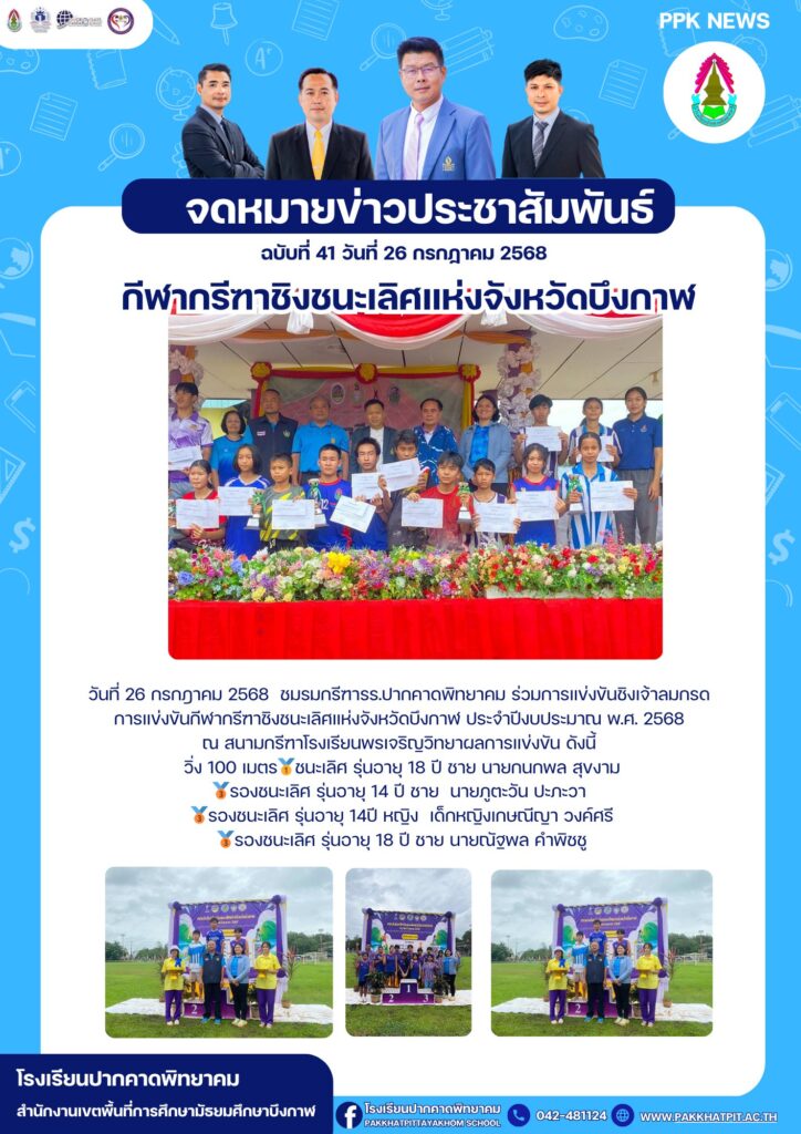 วันที่ 26 กรกฎาคม 2568 ชมรมกรีฑารร.ปากคาดพิทยาคม ร่วมการแข่งขันชิงเจ้าลมกรด การแข่งขันกีฬากรีฑาชิงชนะเลิศแห่งจังหวัดบึงกาฬ ประจำปีงบประมาณ พ.ศ. 2568 ณ สนามกรีฑาโรงเรียนพรเจริญวิทยาผลการแข่งขัน ดังนี้