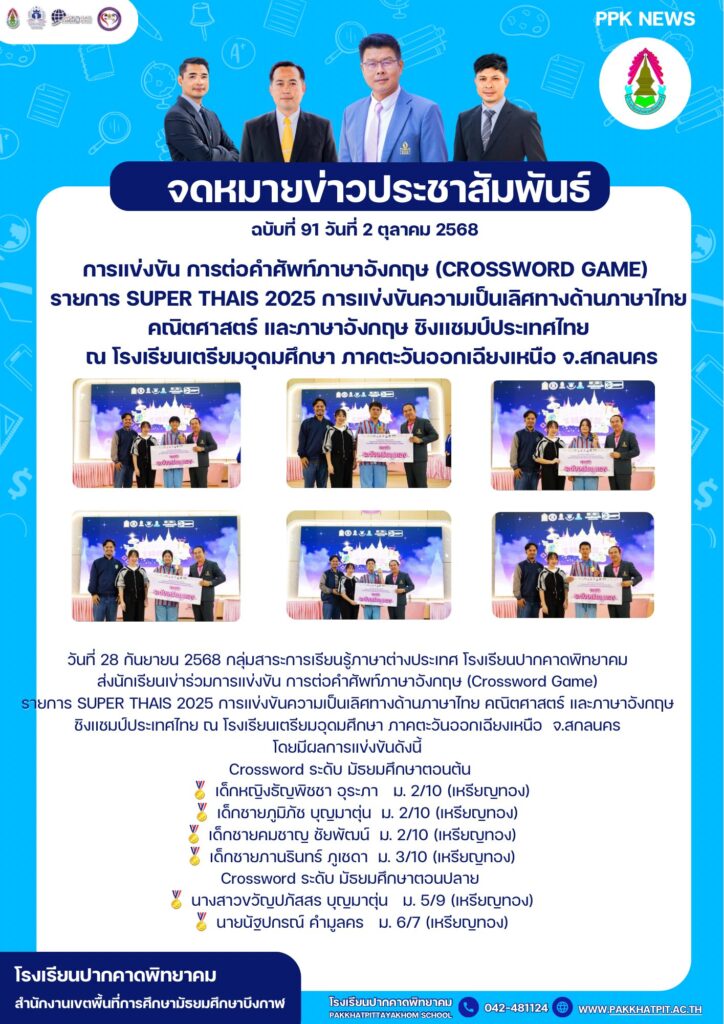วันที่ 28 กันยายน 2568 กลุ่มสาระการเรียนรู้ภาษาต่างประเทศ โรงเรียนปากคาดพิทยาคม ส่งนักเรียนเข่าร่วมการแข่งขัน การต่อคำศัพท์ภาษาอังกฤษ (Crossword Game) รายการ SUPER THAIS 2025 การแข่งขันความเป็นเลิศทางด้านภาษาไทย คณิตศาสตร์ และภาษาอังกฤษ