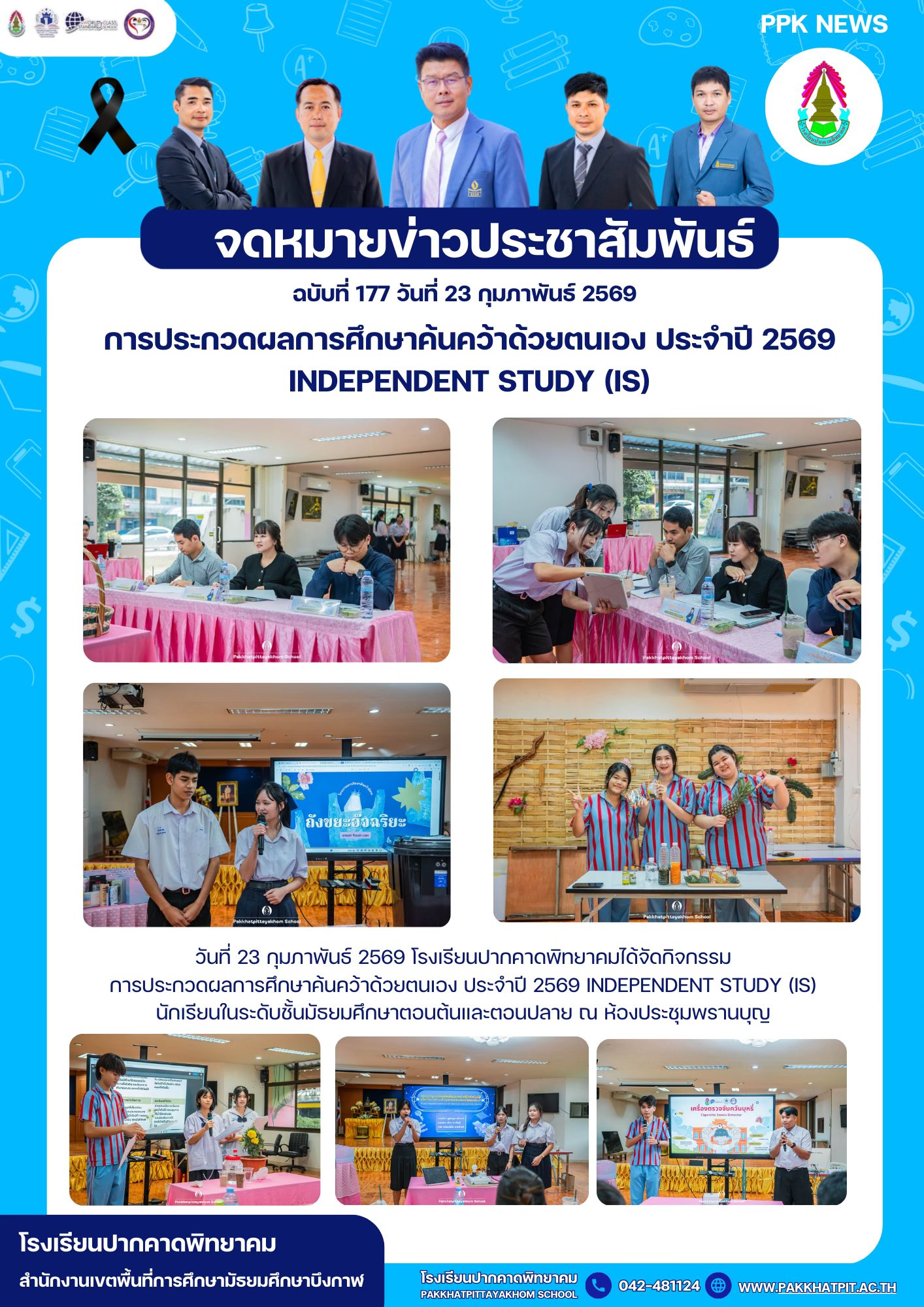 วันที่ 23 กุมภาพันธ์ 2569 โรงเรียนปากคาดพิทยาคมได้จัดกิจกรรม การประกวดผลการศึกษาค้นคว้าด้วยตนเอง ประจำปี 2569 INDEPENDENT STUDY (IS) นักเรียนในระดับชั้นมัธยมศึกษาตอนต้นและตอนปลาย ณ ห้องประชุมพรานบุญ