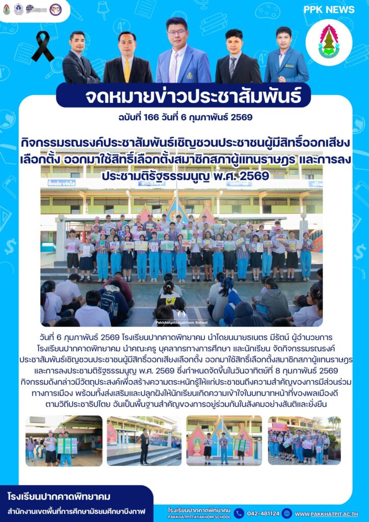 วันที่ 6 ภุมภาพันธ์ 2569 โรงเรียนปากคาดพิทยาคม นำโดยนนายธเนตร มีรัตน์ ผู้อำนวยการโรงเรียนปากคาดพิทยาคม นำคณะครู บุคลากรทางการศึกษา และนักเรียน จัดกิจกรรมรณรงค์ประชาสัมพันธ์เชิญชวนประชาชนผู้มีสิทธิ์ออกเสียงเลือกตั้ง ออกมาใช้สิทธิ์เลือกตั้งสมาชิกสภาผู้แทนราษฎร และการลงประชามติรัฐธรรมนูญ พ.ศ. 2569 ซึ่งกำหนดจัดขึ้นในวันอาทิตย์ที่ 8 กุมภาพันธ์ 2569 กิจกรรมดังกล่าวมีวัตถุประสงค์เพื่อสร้างความตระหนักรู้ให้แก่ประชาชนถึงความสำคัญของการมีส่วนร่วมทางการเมือง พร้อมทั้งส่งเสริมและปลูกฝังให้นักเรียนเกิดความเข้าใจในบทบาทหน้าที่ของพลเมืองดี ตามวิถีประชาธิปไตย อันเป็นพื้นฐานสำคัญของการอยู่ร่วมกันในสังคมอย่างสันติและยั่งยืน
