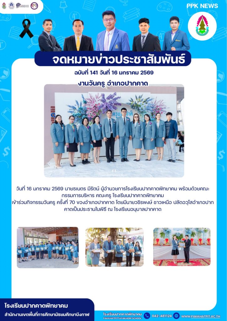 วันที่ 16 มกราคม 2569 นายธเนตร มีรัตน์ ผู้อำนวยการโรงเรียนปากคาดพิทยาคม พร้อมด้วยคณะกรรมการบริหาร คณะครู โรงเรียนปากคาดพิทยาคม เข้าร่วมกิจกรรมวันครู ครั้งที่ 70 ของอำเภอปากคาด โดยมีนายวชิรพงษ์ ชาวเหนือ ปลัดอวุโสอำเภอปากคาดเป็นประธานในพิธี ณ โรงเรียนอนุบาลปากคาด