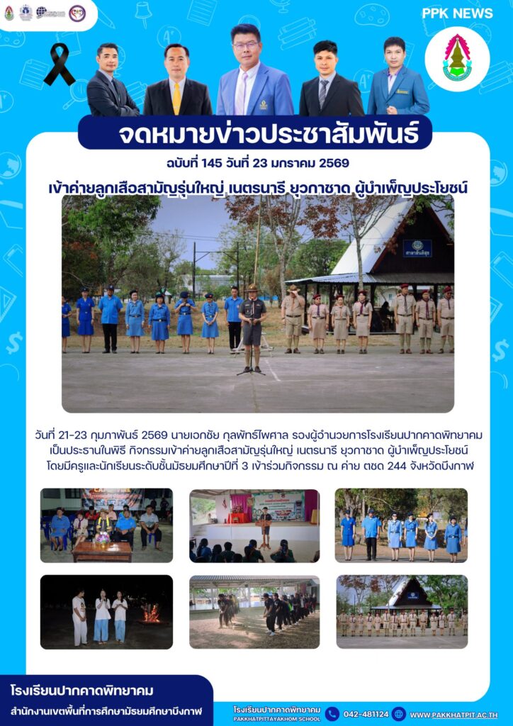 วันที่ 22-23 มกราคม 2569 นายเอกชัย กุลพัทธ์ไพศาล รองผู้อำนวยการโรงเรียนปากคาดพิทยาคม เป็นประธานในพิธี กิจกรรมเข้าค่ายลูกเสือสามัญรุ่นใหญ่ เนตรนารี ยุวกาชาด ผู้บำเพ็ญประโยชน์ โดยมีครูและนักเรียนระดับชั้นมัธยมศึกษาปีที่ 3 เข้าร่วมกิจกรรม ณ ค่าย ตชด 244 จังหวัดบึงกาฬ