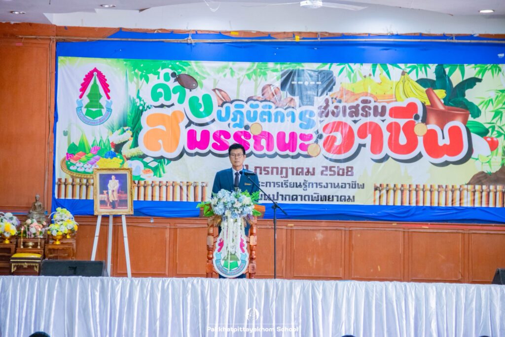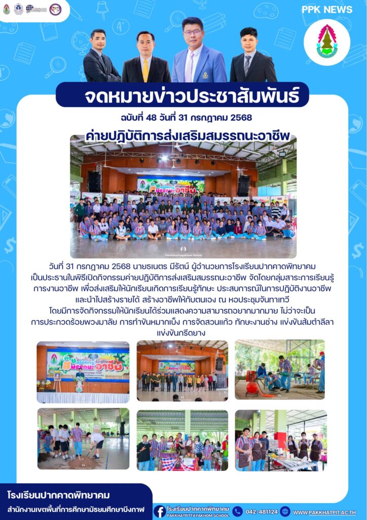วันที่ 31 กรกฏาคม 2568 นายธเนตร มีรัตน์ ผู้อำนวยการโรงเรียนปากคาดพิทยาคม เป็นประธานในพิธีเปิดกิจกรรมค่ายปฏิบัติการส่งเสริมสมรรถนะอาชีพ จัดโดยกลุ่มสาระการเรียนรู้การงานอาชีพ เพื่อส่งเสริมให้นักเรียนเกิดการเรียนรู้ทักษะ ประสบการณ์ในการปฏิบัติงานอาชีพและนำไปสร้างรายได้ สร้างอาชีพให้กับตนเอง ณ หอประชุมจันทาเทวี