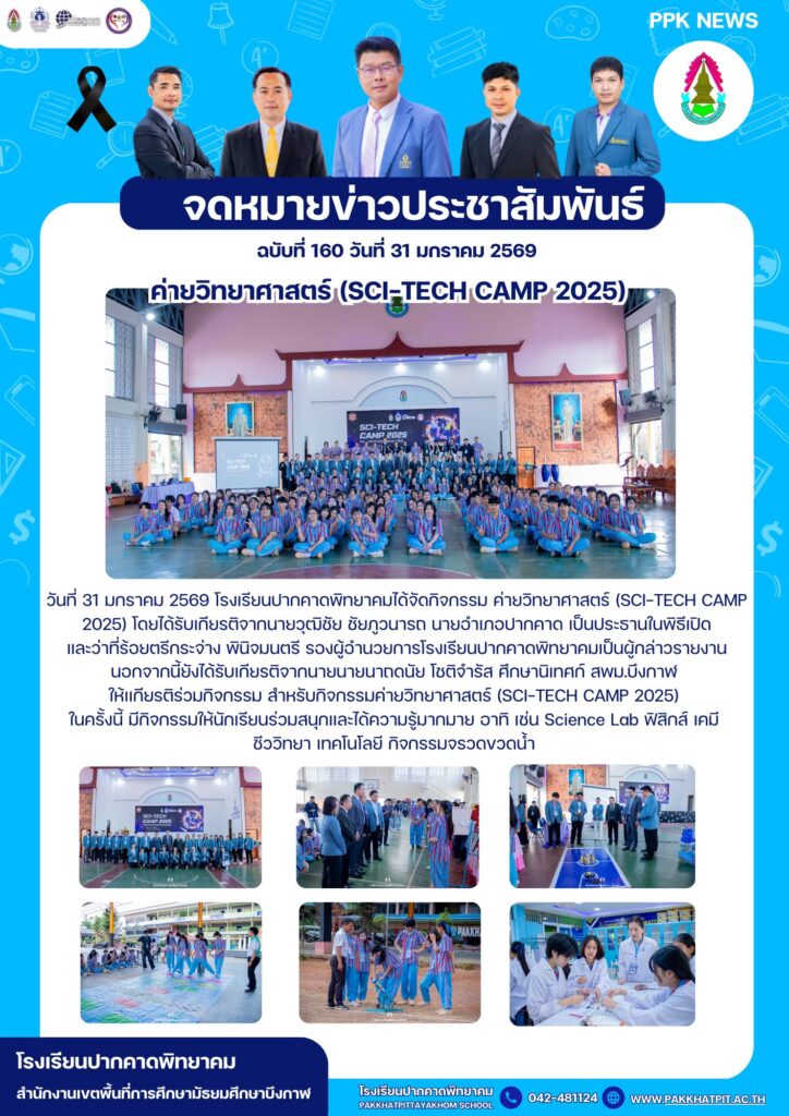 วันที่ 31 มกราคม 2569 โรงเรียนปากคาดพิทยาคมได้จัดกิจกรรม ค่ายวิทยาศาสตร์ (SCI-TECH CAMP 2025) โดยได้รับเกียรติจากนายวุฒิชัย ชัยภูวนารถ นายอำเภอปากคาด เป็นประธานในพิธีเปิดและว่าที่ร้อยตรีกระจ่าง พินิจมนตรี รองผู้อำนวยการโรงเรียนปากคาดพิทยาคมเป็นผู้กล่าวรายงานนอกจากนี้ยังได้รับเกียรติจากนายนายนาถดนัย โชติจำรัส ศึกษานิเทศก์ สพม.บึงกาฬ ให้เเกียรติร่วมกิจกรรม สำหรับกิจกรรมค่ายวิทยาศาสตร์ (SCI-TECH CAMP 2025) ในครั้งนี้ มีกิจกรรมให้นักเรียนร่วมสนุกและได้ความรู้มากมาย อาทิ เช่น Science Lab ฟิสิกส์ เคมี ชีววิทยา เทคโนโลยี กิจกรรมจรวดขวดน้ำ