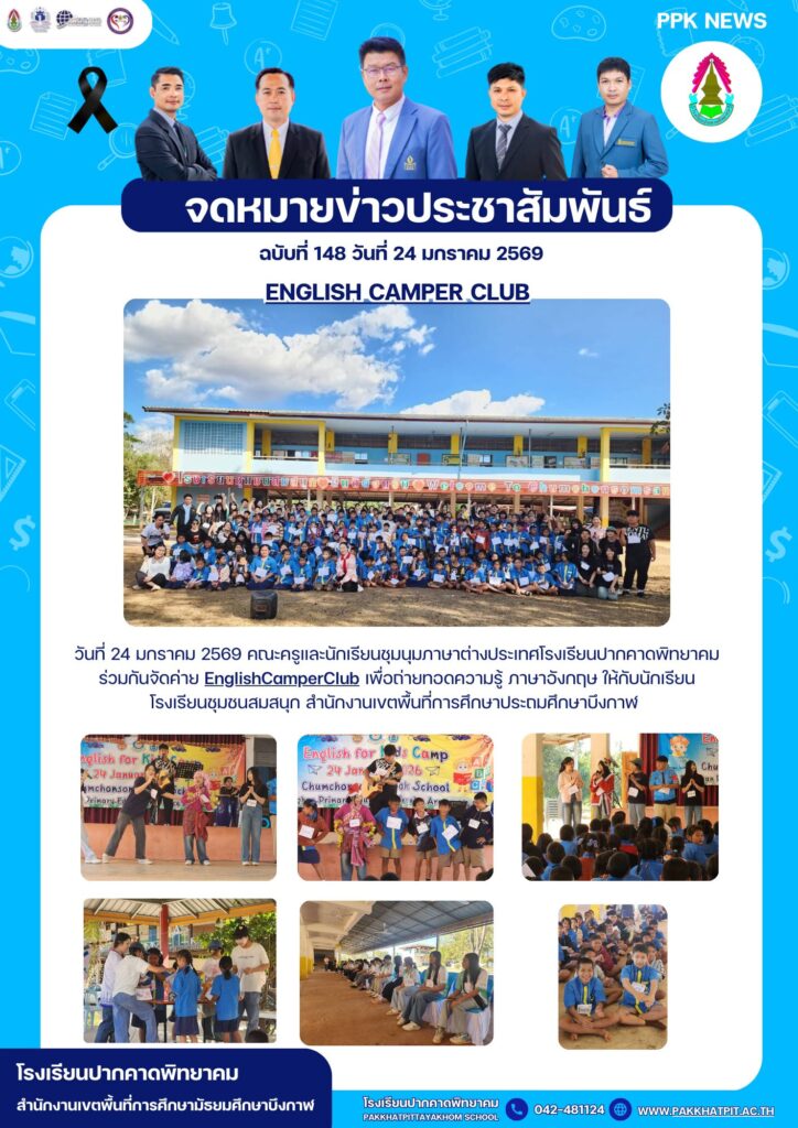 วันที่ 24 มกราคม 2569 คณะครูและนักเรียนชุมนุมภาษาต่างประเทศโรงเรียนปากคาดพิทยาคมร่วมกันจัดค่าย EnglishCamperClub เพื่อถ่ายทอดความรู้ ภาษาอังกฤษ ให้กับนักเรียน โรงเรียนชุมชนสมสนุก สำนักงานเขตพื้นที่การศึกษาประถมศึกษาบึงกาฬ