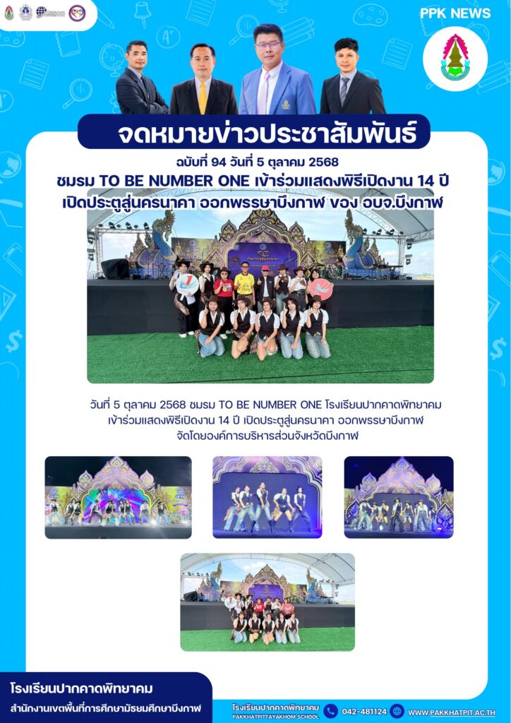 วันที่ 5 ตุลาคม 2568 ชมรม TO BE NUMBER ONE โรงเรียนปากคาดพิทยาคม เข้าร่วมแสดงพิธีเปิดงาน 14 ปี เปิดประตูสู่นครนาคา ออกพรรษาบึงกาฬ จัดโดยองค์การบริหารส่วนจังหวัดบึงกาฬ