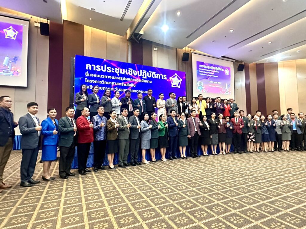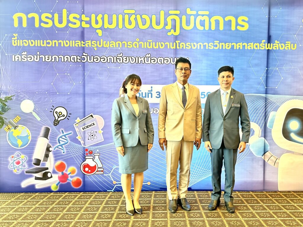 นายธเนตร มีรัตน์ ผู้อำนวยการ นายเอกชัย กุลพัทธ์ไพศาลรองผู้อำนวยการกลุ่มบริหารวิชาการ และนางรุ่งทิวา คำแฝง ครูผู้ประสานงานโครงการวิทยาศาสตร์พลังสิบเข้าร่วมการประชุมเชิงปฏิบัติการชี้แจงแนวทางและสรุปผลการดำเนินงานโครงการวิทยาศาสตร์พลังสิบ เครือข่ายภาคตะวันออกเฉียงเหนือ