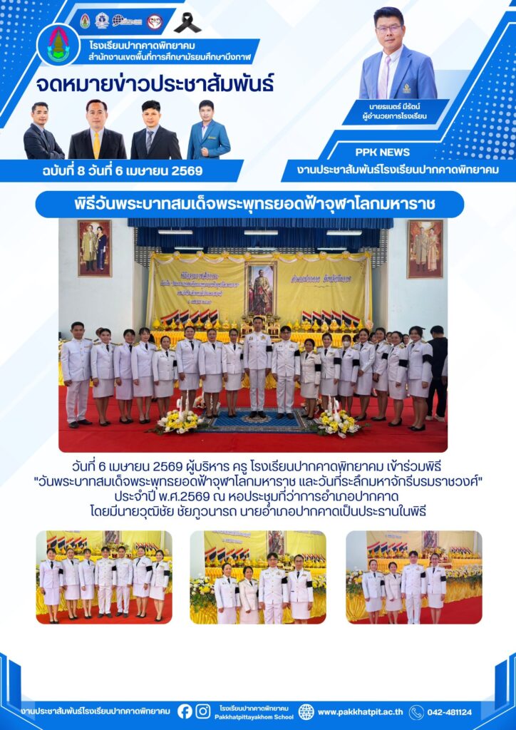 วันที่ 6 เมษายน 2569 ผู้บริหาร ครู โรงเรียนปากคาดพิทยาคม เข้าร่วมพิธี “วันพระบาทสมเด็จพระพุทธยอดฟ้าจุฬาโลกมหาราช และวันที่ระลึกมหาจักรีบรมราชวงศ์” ประจำปี พ.ศ.2569 ณ หอประชุมที่ว่าการอำเภอปากคาด โดยมีนายวุฒิชัย ชัยภูวนารถ นายอำเภอปากคาดเป็นประธานในพิธี