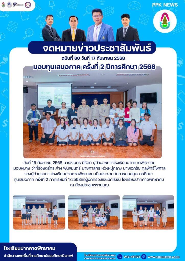 มอบทุนการศึกษา ทุนเสมอภาค ครั้งที่ 2 ภาคเรียนที่ 1/2568 แก่ผู้ปกครองและนักเรียน โรงเรียนปากคาดพิทยาคม