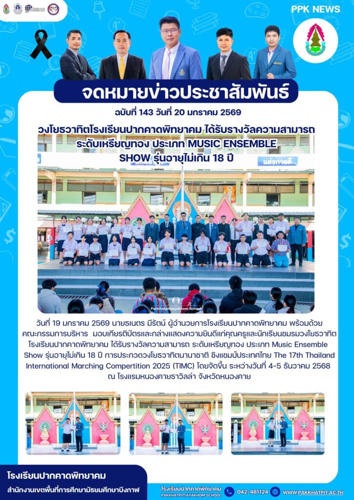 วันที่ 19 มกราคม 2569 นายธเนตร มีรัตน์ ผู้อำนวยการโรงเรียนปากคาดพิทยาคม พร้อมด้วยคณะกรรมการบริหาร มอบเกียรติบัตรและกล่างแสดงความยินดีแก่คุณครูและนักเรียนชมรมวงโยธวาทิตโรงเรียนปากคาดพิทยาคม ได้รับรางวัลความสามารถ ระดับเหรียญทอง ประเภท Music Ensemble Show รุ่นอายุไม่เกิน 18 ปี การประกวดวงโยธวาทิตนานาชาติ ชิงแชมป์ประเทศไทย The 17th Thailand International Marching Compertition 2025 (TIMC) โดยจัดขึ้น ระหว่างวันที่ 4-5 ธันวาคม 2568 ณ โรงแรมหนองคายธาวิลล่า จังหวัดหนองคาย