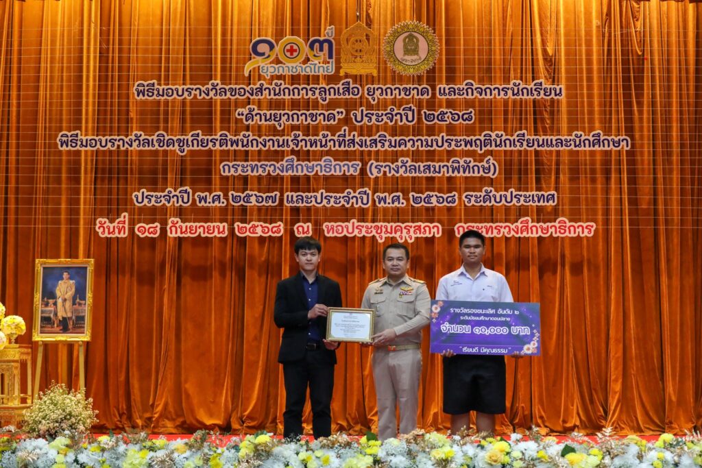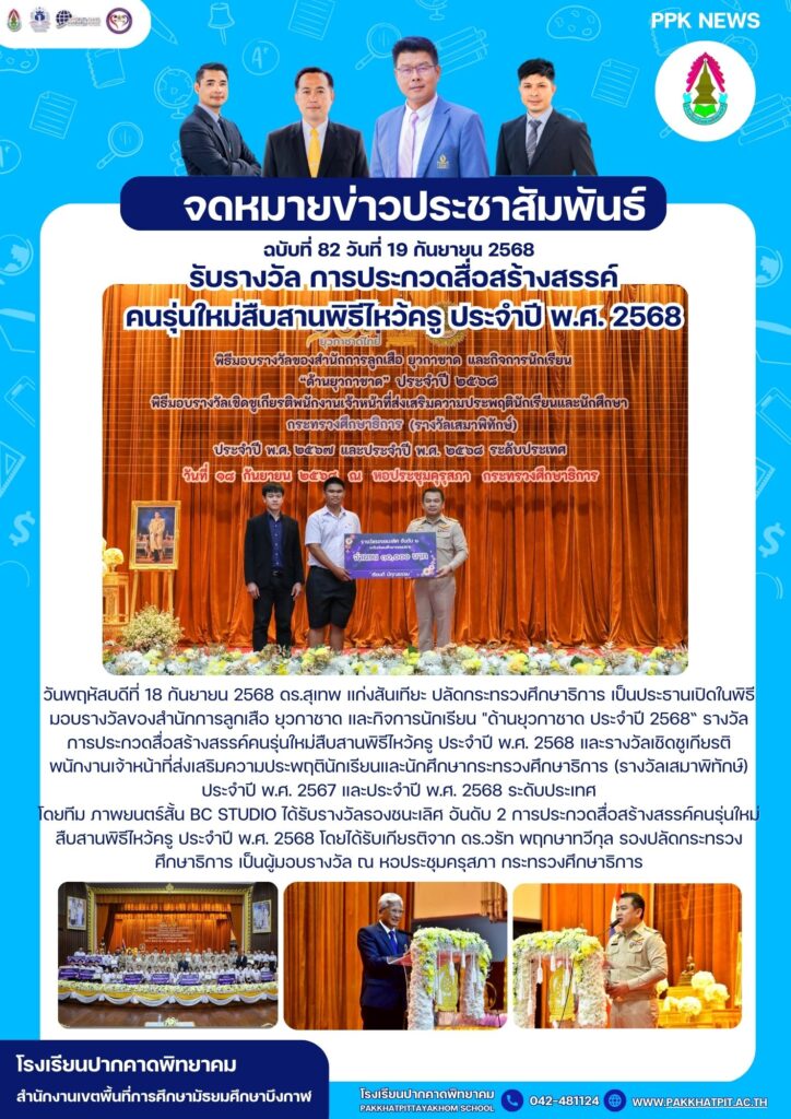 วันที่ 18 กันยายน 2568 ดร.สุเทพ แก่งสันเทียะ ปลัดกระทรวงศึกษาธิการ เป็นประธานเปิดในพิธีมอบรางวัลของสำนักการลูกเสือ ยุวกาชาด และกิจการนักเรียน “ด้านยุวกาชาด ประจำปี 2568“ รางวัลการประกวดสื่อสร้างสรรค์คนรุ่นใหม่สืบสานพิธีไหว้ครู ประจำปี พ.ศ. 2568 และรางวัลเชิดชูเกียรติพนักงานเจ้าหน้าที่ส่งเสริมความประพฤตินักเรียนและนักศึกษากระทรวงศึกษาธิการ (รางวัลเสมาพิทักษ์) ประจำปี พ.ศ. 2567 และประจำปี พ.ศ. 2568 ระดับประเทศ โดยทีม ภาพยนตร์สั้น BC STUDIO ได้รับรางวัลรองชนะเลิศ อันดับ 2 การประกวดสื่อสร้างสรรค์คนรุ่นใหม่สืบสานพิธีไหว้ครู ประจำปี พ.ศ. 2568 โดยได้รับเกียรติจาก ดร.วรัท พฤกษาทวีกุล รองปลัดกระทรวงศึกษาธิการ เป็นผู้มอบรางวัล ณ หอประชุมครุสภา กระทรวงศึกษาธิการ