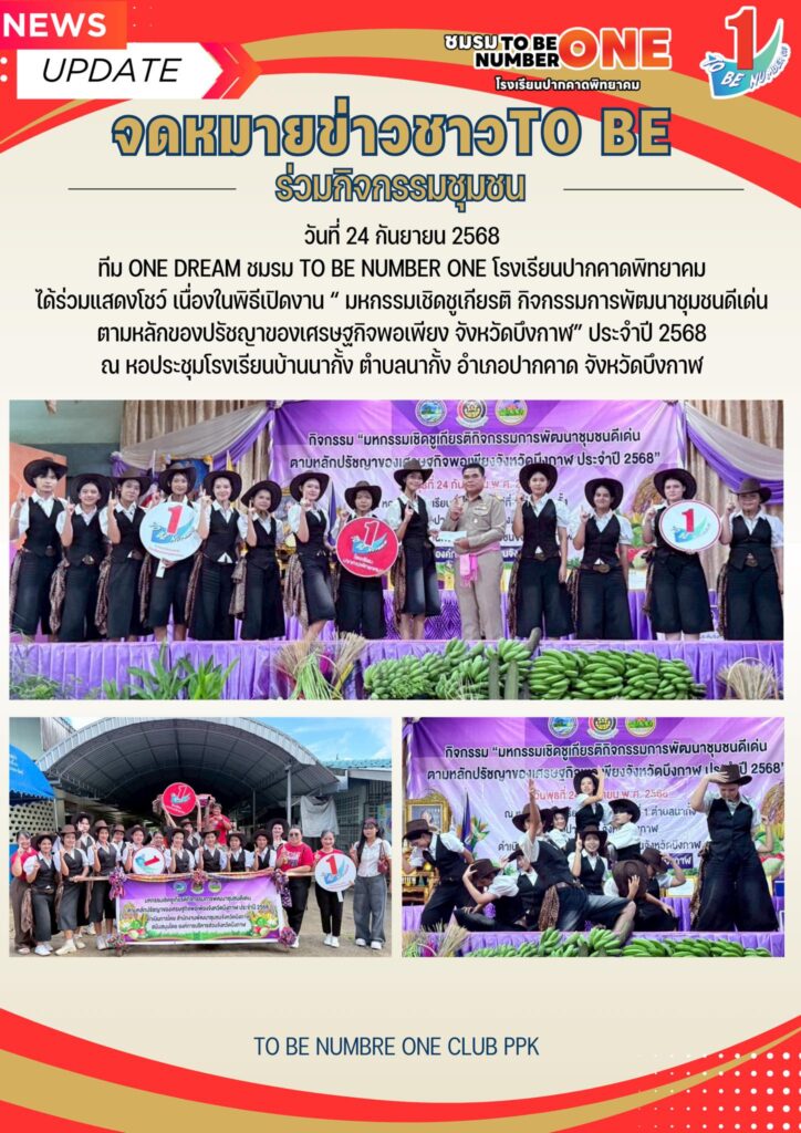 วันที่ 24 กันยายน 2568 ทีม ONE DREAM ชมรม TO BE NUMBER ONE โรงเรียนปากคาดพิทยาคม ได้ร่วมแสดงโชว์ เนื่องในพิธีเปิดงาน “ มหกรรมเชิดชูเกียรติ กิจกรรมการพัฒนาชุมชนดีเด่น ตามหลักของปรัชญาของเศรษฐกิจพอเพียง จังหวัดบึงกาฬ” ประจำปี 2568 ณ หอประชุมโรงเรียนบ้านนากั้ง ตำบลนากั้ง อำเภอปากคาด จังหวัดบึงกาฬ