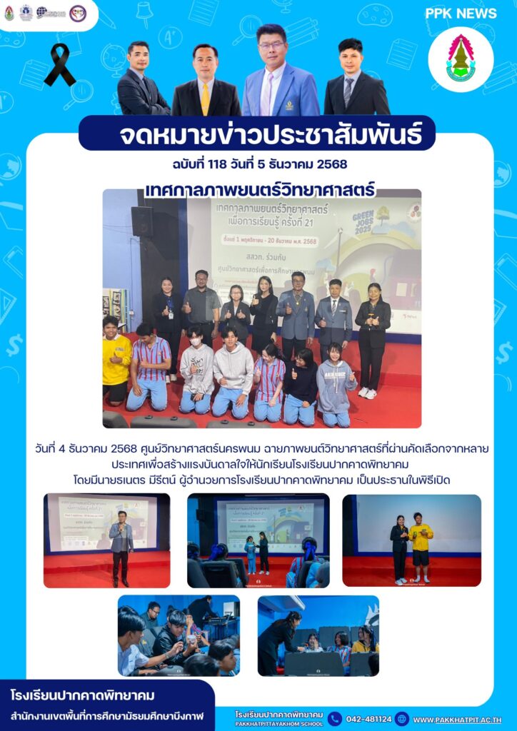 วันที่ 4 ธันวาคม 2568 ศูนย์วิทยาศาสตร์นครพนม ฉายภาพยนต์วิทยาศาสตร์ที่ผ่านคัดเลือกจากหลายประเทศเพื่อสร้างแรงบันดาลใจให้นักเรียนโรงเรียนปากคาดพิทยาคม โดยมีนายธเนตร มีรีตน์ ผู้อำนวยการโรงเรียนปากคาดพิทยาคม เป็นประธานในพิธีเปิด