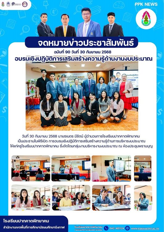 วันที่ 30 กันยายน 2568 นายธเนตร มีรัตน์ ผู้อำนวยการโรงเรียนปากคาดพิทยาคม เป็นประธานในพิธีเปิด การอบรมเชิงปฏิบัติการเสริมสร้างความรู้ด้านการบริหารงบประมาณให้แก่ครูโรงเรียนปากคาดพิทยาคม ซึ่งจัดโดยกลุ่มงานบริหารงานงบประมาณ ณ ห้องประชุมพรานบุญ