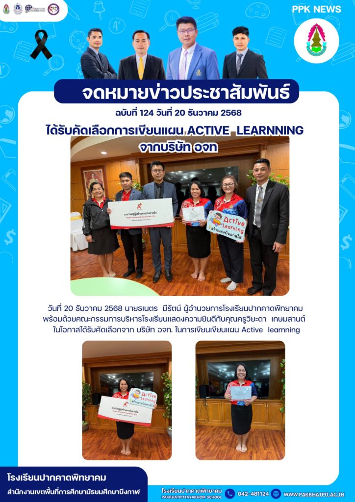 วันที่ 20 ธันวาคม 2568 นายธเนตร มีรัตน์ ผู้อำนวยการโรงเรียนปากคาดพิทยาคม พร้อมด้วยคณะกรรมการบริหารโรงเรียนแสดงความยินดีกับคุณครูวิยะดา เกษมสานต์ คุณครูกลุ่มสาระการเรียนรู้วิทยาศาสตร์และเทคโนโลยีโรงเรียนปากคาดพิทยาคม ในโอกาสได้รับคัดเลือกจาก บริษัท อจท. ในการเขียนเขียนแผน Active learnning
