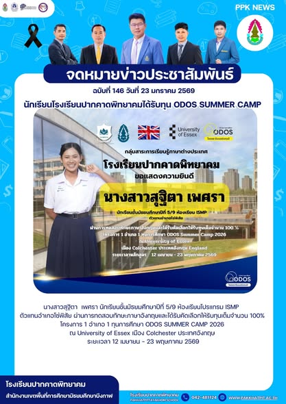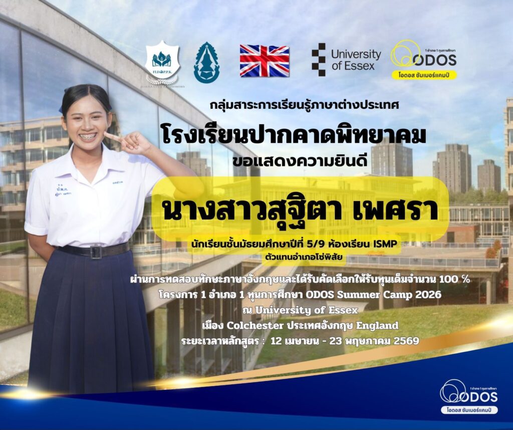 นางสาวสุฐิตา เพศรา นักเรียนชั้นมัธยมศึกษาปีที่ 5/9 ห้องเรียนโปรแกรม ISMP ตัวแทนอำเภอโซ่พิสัย ผ่านการทดสอบทักษะภาษาอังกฤษและได้รับคัดเลือกให้รับทุนเต็มจำนวน 100% โครงการ 1 อำเภอ 1 ทุนการศึกษา ODOS SUMMER CAMP 2026 ณ University of Essex เมือง Colchester ประเทศอังกฤษ ระยะเวลา 12 เมษายน – 23 พฤษภาคม 2569 ” สุธิตา #อังกฤษ#UniversityofEssex