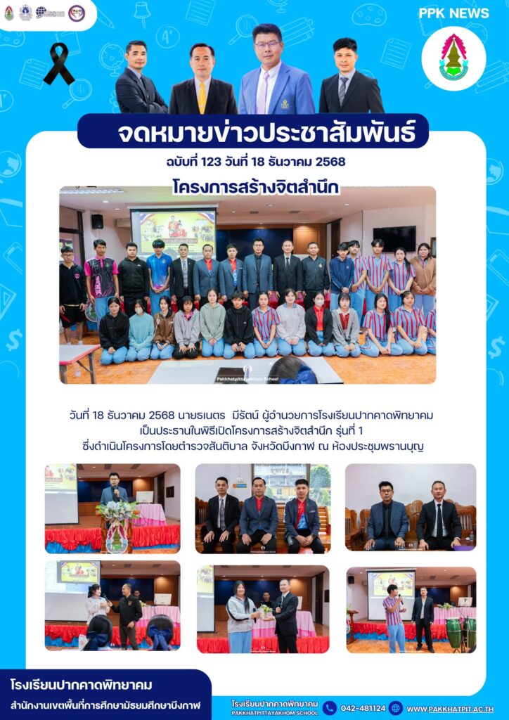 วันที่ 18 ธันวาคม 2568 นายธเนตร มีรัตน์ ผู้อำนวยการโรงเรียนปากคาดพิทยาคม เป็นประธานในพิธีเปิดโครงการสร้างจิตสำนึก รุ่นที่ 1 ซึ่งดำเนินโครงการโดยตำรวจสันติบาล จังหวัดบึงกาฬ ณ ห้องประชุมพรานบุญ