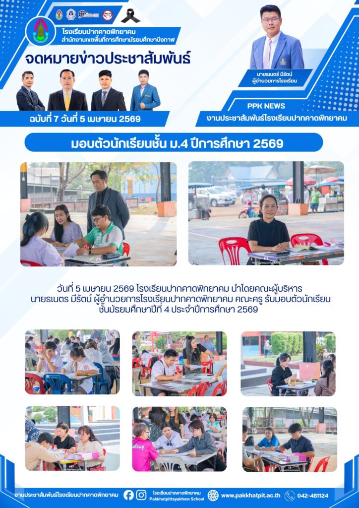 วันที่ 5 เมษายน 2569 โรงเรียนปากคาดพิทยาคม นำโดยคณะผู้บริหาร นายธเนตร มีรัตน์ ผู้อำนวยการโรงเรียนปากคาดพิทยาคม คณะครู รับมอบตัวนักเรียนชั้นมัธยมศึกษาปีที่ 4 ประจำปีการศึกษา 2569